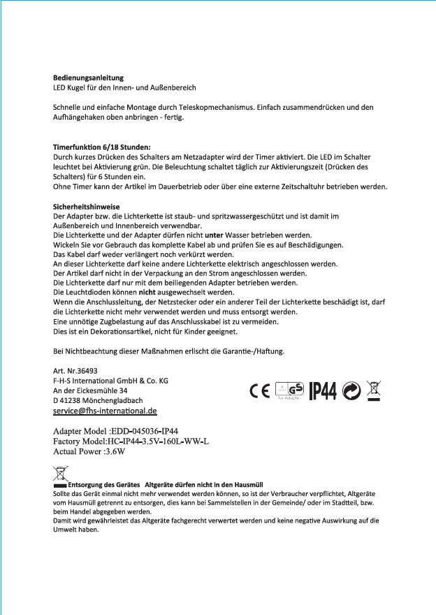 Dank der 3 Meter langen Zuleitung und des spritzwassergeschützten IP44-Adapters eignet sich die LED-Kugel ideal für den Innen- und Außenbereich. Der integrierte Timer (6 Stunden an / 18 Stunden aus) macht den Betrieb besonders komfortabel – einmal eingestellt, schaltet sich das Licht automatisch zur gewünschten Zeit ein und aus.