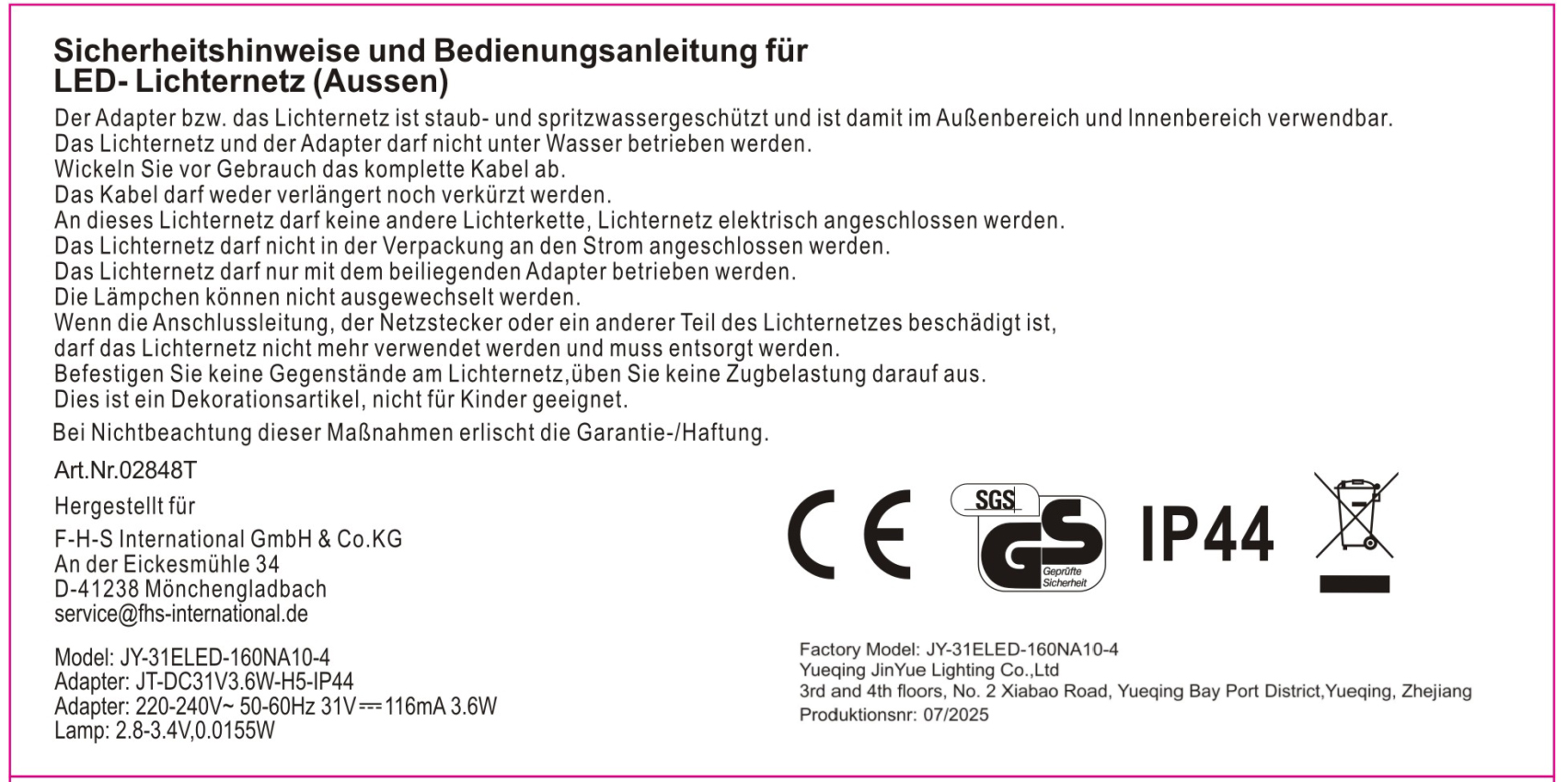 Mit einer großzügigen Zuleitung von 5 Metern haben Sie die Flexibilität, das Netz überall zu platzieren und den mitgelieferten IP44 Außenadapter zu nutzen, der dafür sorgt, dass Ihre Lichterkette selbst bei schlechtem Wetter sicher funktioniert.