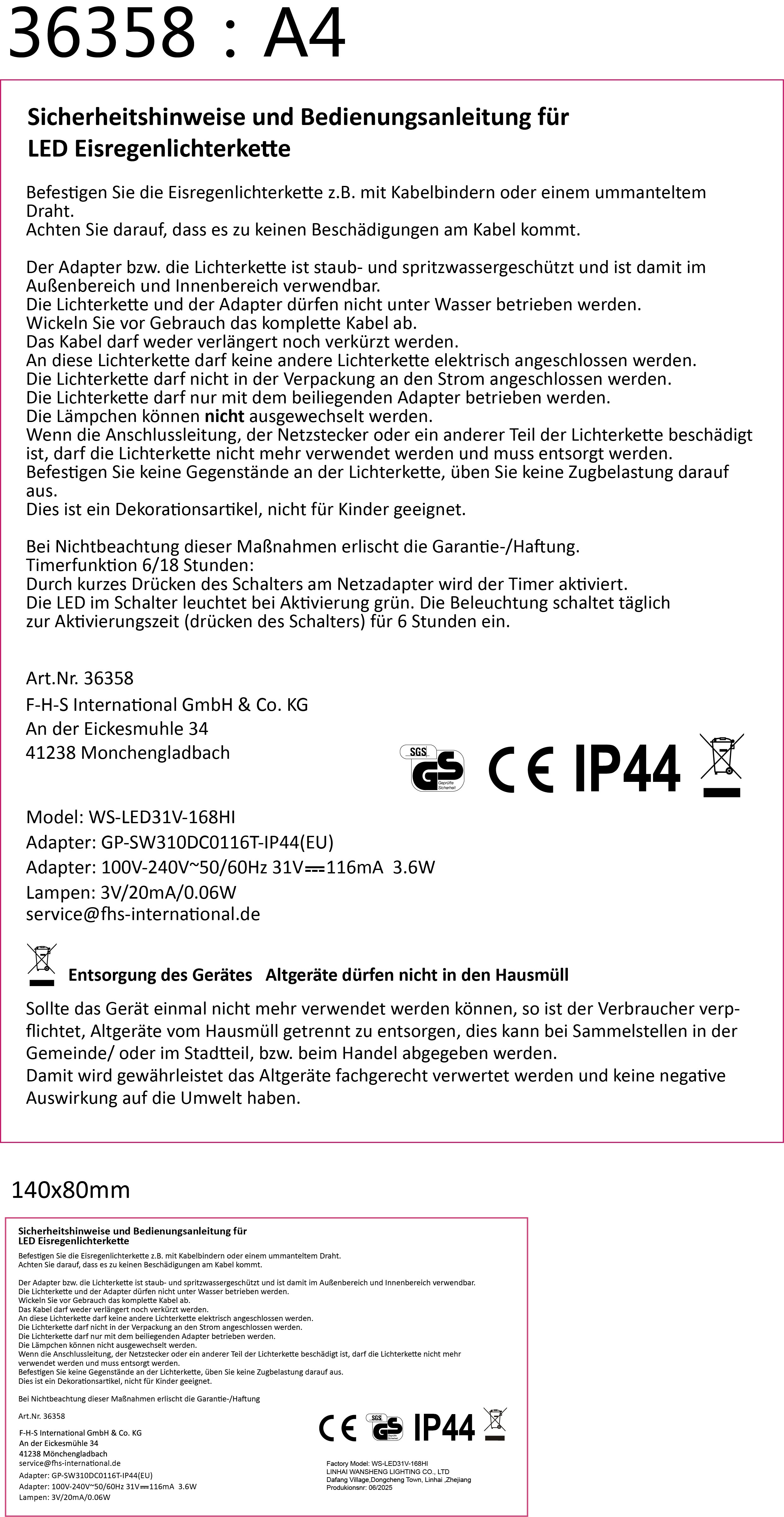 - Schutzklasse: IP44 (für den Außenbereich geeignet)