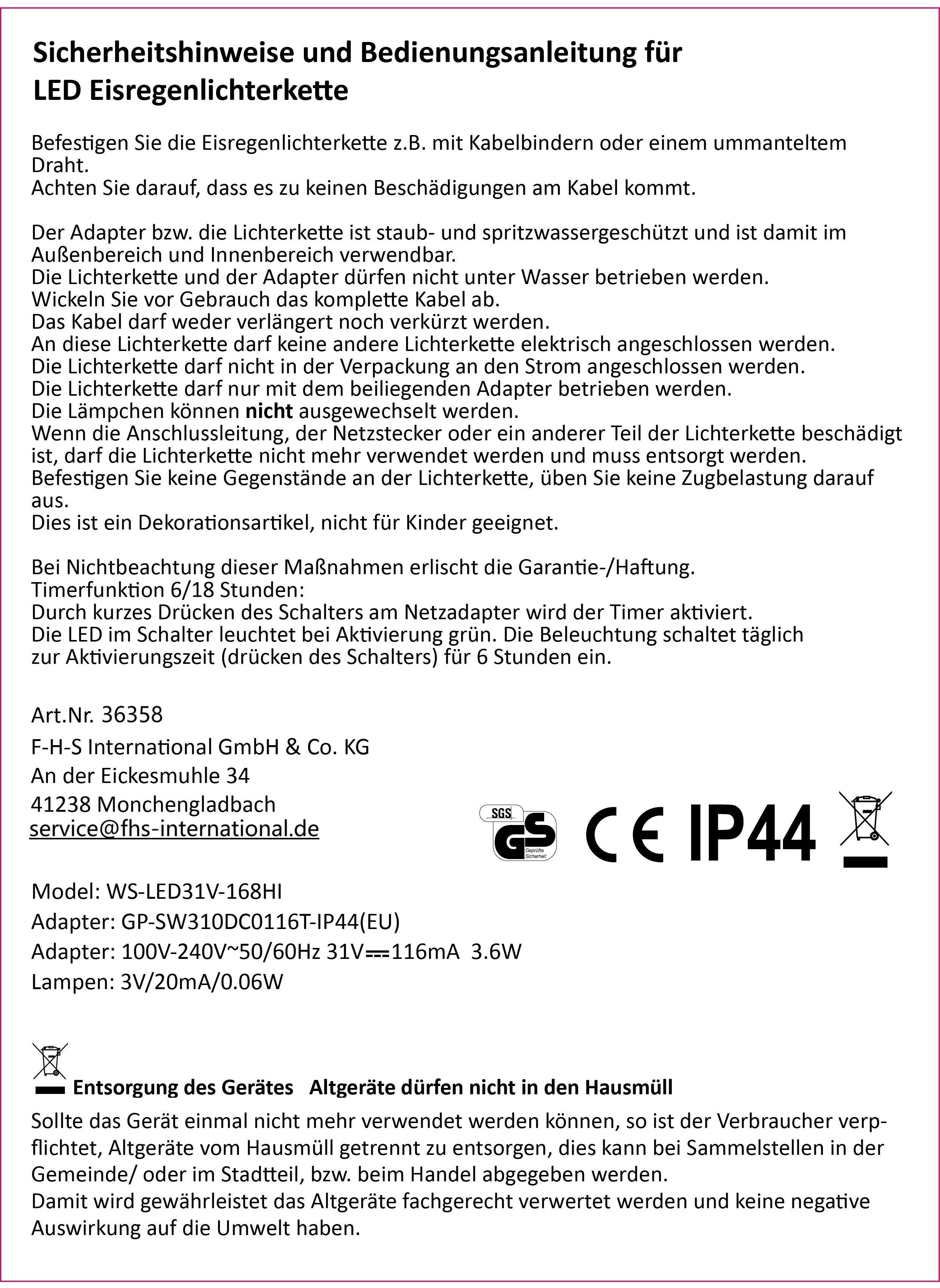 - Stromversorgung: 31 V Außentrafo (inklusive)