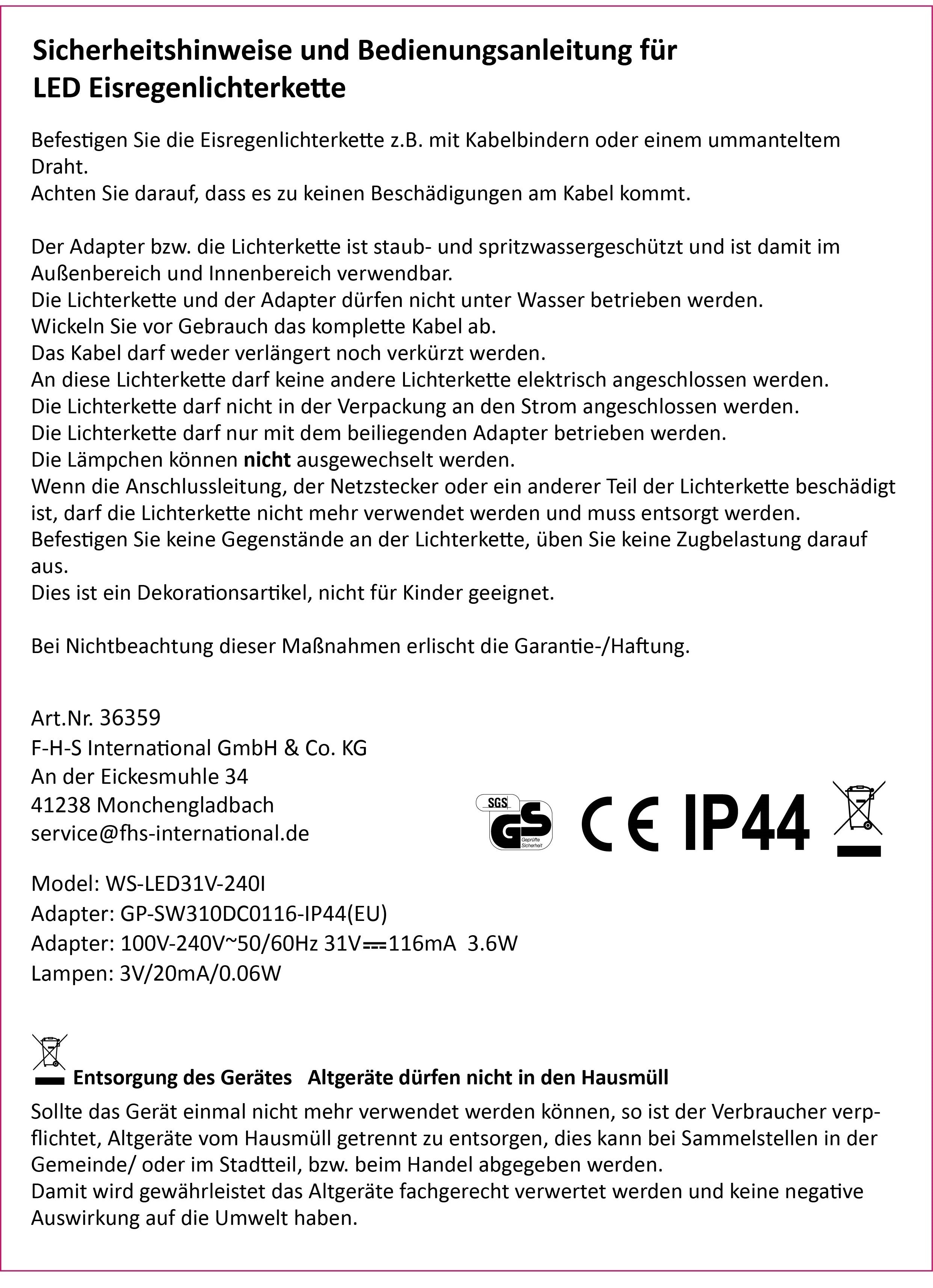 - Stromversorgung: 31 V IP44-Außentrafo (inkl.)