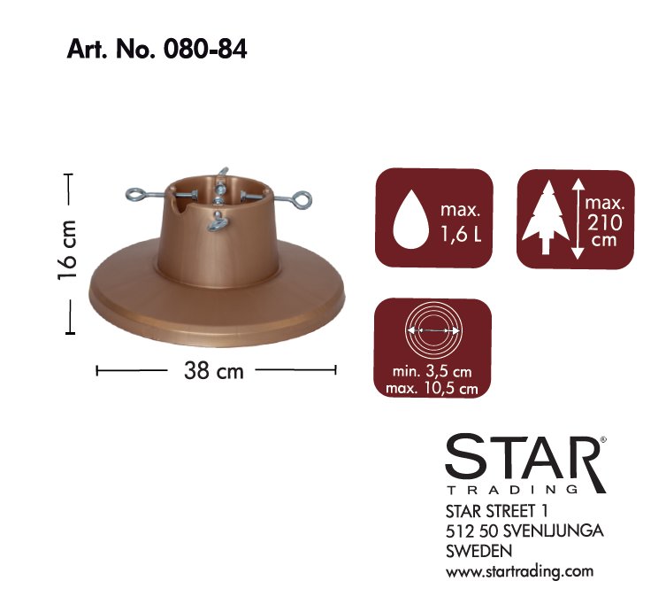 Der Christbaumständer Granig besteht aus goldenem Kunststoff und hat ein minimalistisches Design. Er ist ideal für den Innenbereich geeignet. Der Baumständer kann bis zu 1,6 Liter Wasser fassen. Der Halter ist ideal für Baumstämme mit einem Durchmesser von 3,5-10,5 cm und einer Baumhöhe von 210 cm geeignet. Abmessungen: Höhe: 16 cm, Länge: 38 cm, Breite: 38 cm.