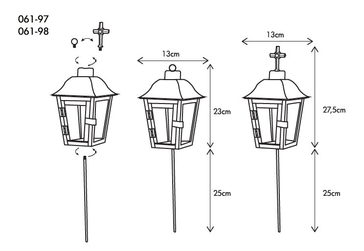 Die schöne Laterne besteht aus einem weißen Leuchtenkörper mit wechselbarem Aufsatz - einer Kugel und einem Kreuz. Die Grablaterne kann ganz einfach mit Kerzen Deiner Wahl kombiniert werden und so für die richtige Stimmung sorgen. Durch den Erdspieß lässt sich die Laterne einfach im Boden platzieren und kann flexibel eingesetzt werden. Je nach Aufsatz kann die Outdoor-Laterne als Grablaterne oder als Garten-Dekoration eingesetzt werden. Abmessungen: Höhe: 45 cm, Länge: 13,5 cm, Breite: 13,5 cm.