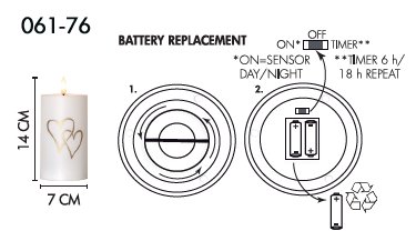 Die weiße LED Kerze hat einen schönen Aufdruck mit zwei goldenen Herzen und verfügt über eine realistische LED Flamme. Die integrierte LED strahlt in einem angenehmen warmweißen Licht und sorgt so für eine gemütliche Atmosphäre. Der Timer sorgt dafür, dass sich die LED Kerze nach einer Brenndauer von 6 Stunden automatisch für 18 Stunden ausschaltet. Neben dem Timer kann außerdem der praktische Dämmerungssensor verwendet werden. Die zwei nötigen AA Batterien sind nicht im Lieferumfang enthalten. Abmessungen: Höhe: 14 cm, Länge: 7 cm, Breite: 7 cm.